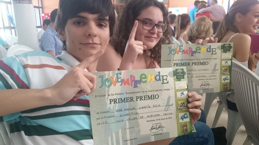 De todos los equipos redactores de planes de empresa finalmente fueron seleccionados 8 Planes, para la fase final del concurso celebrado en el IES López de Arenas, cuya fase final de presentación de proyectos se celebró el pasado 10 de junio. Tras la exposición de las ideas empresariales seleccionadas, el jurado otorgó el primer premio del certamen a nuestros alumnos de 2º de SMR, José Manuel García Isla y Nathalie Marín Victorio por su empresa DUINÓTICA, S.L. basada en la formación precoz de lenguajes de programación y construcción de Robots, así como comercialización de componentes electrónicos necesarios para su montaje. En tercer lugar del concurso de Marchena resultaron agraciados los alumnos también de 2º SMR, Fernando Franco y Enrique Fernández, con su empresa MEGAREPUESTOS, S.L., especializada en la gestión inteligente para la búsqueda de piezas en empresas dedicadas al desguaces y recuperación de piezas de vehículos usados.