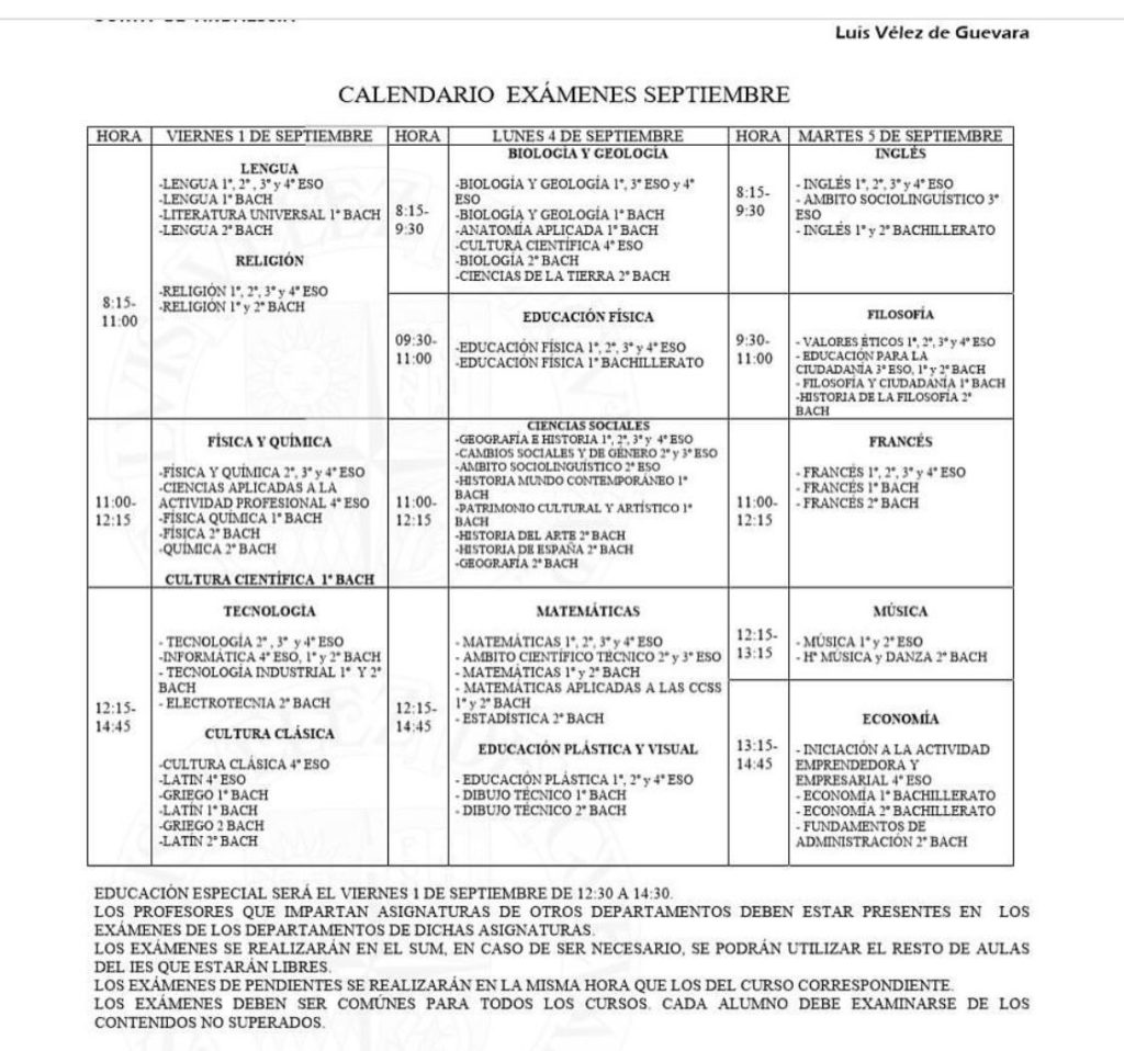 Actualidad Calendario exámenes Septiembre 2017 miércoles, 30 de agosto de 2017martes, 16 de julio de 2019 Luis Vélez de Guevara
